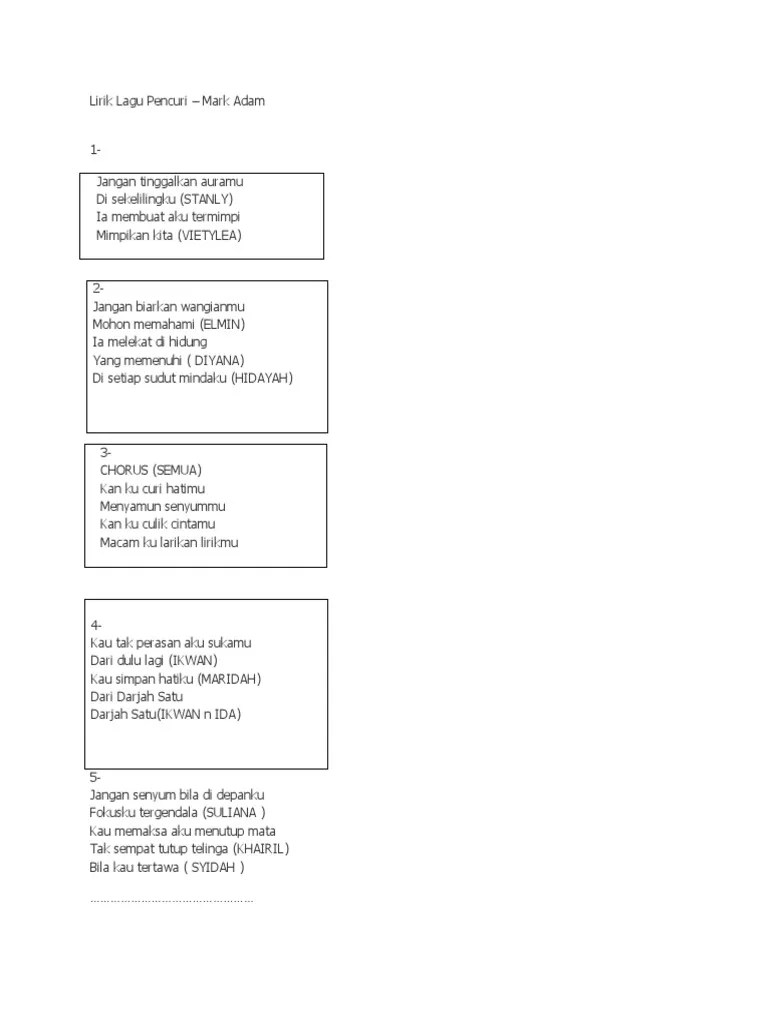 Ukulele chords and tabs for pencuri by mark adam. Kord gitar lagu pencuri by mark adam kord lagu pencuri by mark adam intro : A a gbm jangan tinggalkan auramu d e di sekelilingku a gbm ia membuat aku termimpi d e a . Am c jangan tinggalkan auramu f g di sekelilingku am c ia membuat aku. A a f#m jangan tinggalkan auramu d e di sekelilingku a f#m ia . Jangan tinggalkan auramu · di sekelilingku · ia membuat aku termimpi · yang memenuhi · di setiap sudut mindaku · jangan senyum bila di depanku · fokusku tergendala .